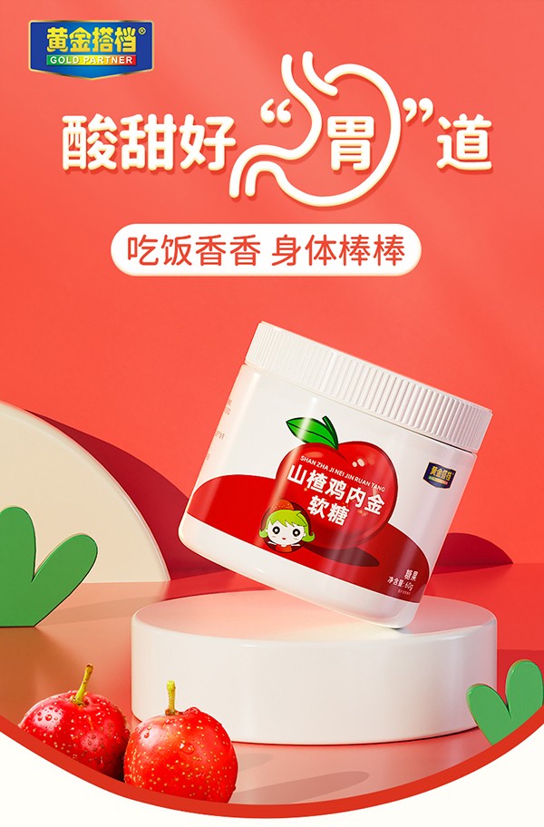 黃金搭檔山楂雞內(nèi)金軟糖,植物草本配方,綠色安全!精選果實(shí)飽滿的優(yōu)質(zhì)山楂為原料,更添加雞內(nèi)金提取物、維生素C等,科學(xué)配比,美味營養(yǎng)!以麥芽糖醇代替蔗糖,降低甜度,呵護(hù)幼齒!顆顆獨(dú)立包裝,干凈衛(wèi)生易攜帶,拆袋即食,酸甜口感,拯救“小飯渣”,讓孩子“食”力全開,茁壯成長!