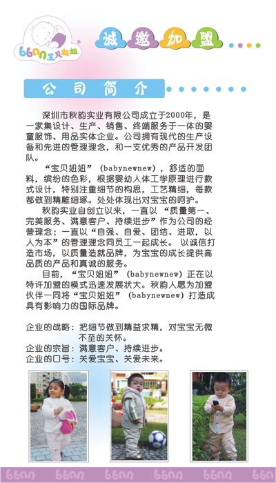 深圳市秋韻實業(yè)有限公司成立于2000年,是一家集設(shè)計、生產(chǎn)、銷售、終端服務(wù)于一體的嬰童服飾、用品實體企業(yè)。公司擁有現(xiàn)代的生產(chǎn)設(shè)備和先進(jìn)的管理理念,和一支優(yōu)秀的產(chǎn)品開發(fā)團隊。