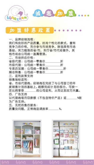 目前,“寶貝妞妞”(babynewnew)正在以特許加盟的模式迅速發(fā)展?fàn)畲蟆G镯嵢嗽笧榧用嘶锇橐煌瑢ⅰ皩氊愭ゆぁ保╞abynewnew)打造成具有影響力的國際品牌。