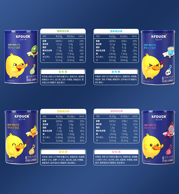 功夫小鴨嬰幼兒小溶豆系列,有獼猴桃味、香蕉胡蘿卜味、火龍果味、原味等,共四種口味,甄選食材,精湛制作,營養(yǎng)高度保留,入口即溶,好吃不膩。